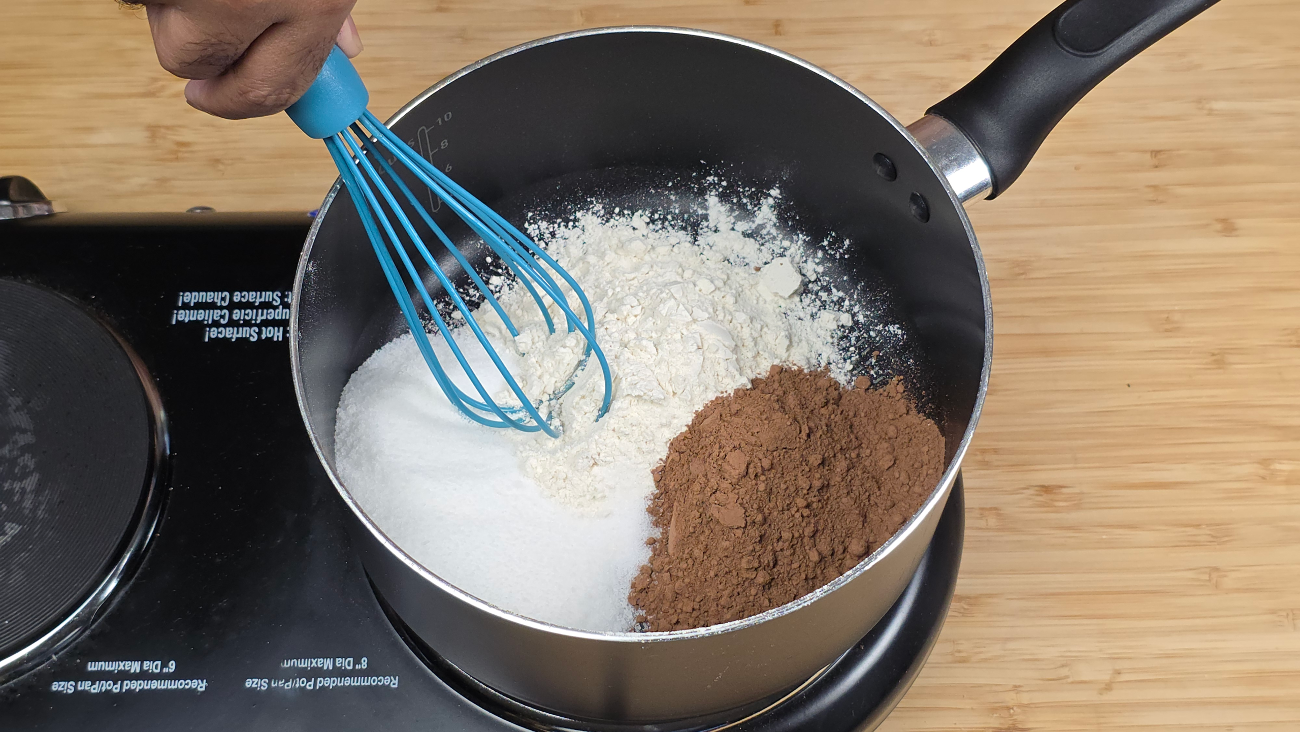 • Add flour, cocoa powder, salt, sugar and half + half to cool 3qt saucepan and mix until combined, ensuring few/no clumps.