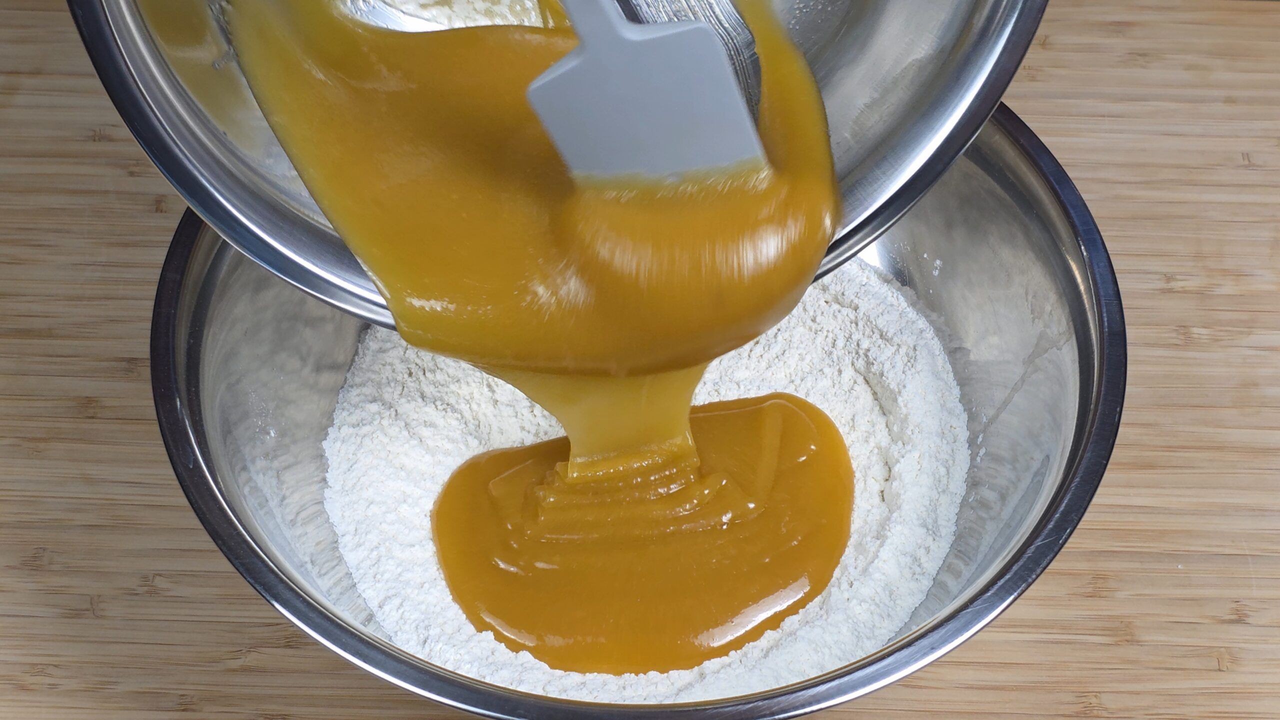 • Add other wet ingredients (Egg Yolks, Vanilla Extract) to combined Butter + Sugar and whisk for 30 seconds each until combined.