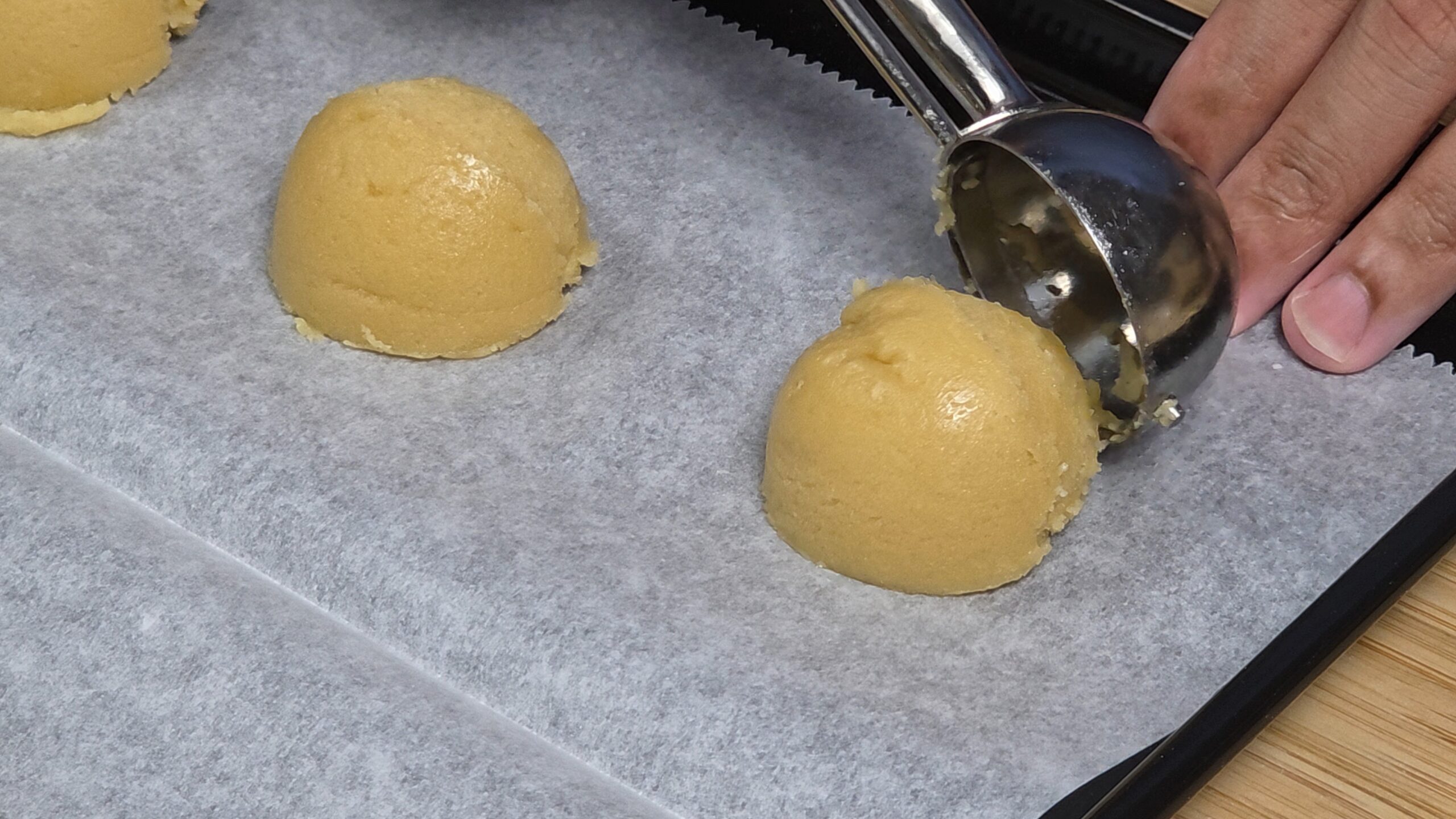 • Using cookie scoop, place dough onto cookie sheet and ensure they are evenly spaced.