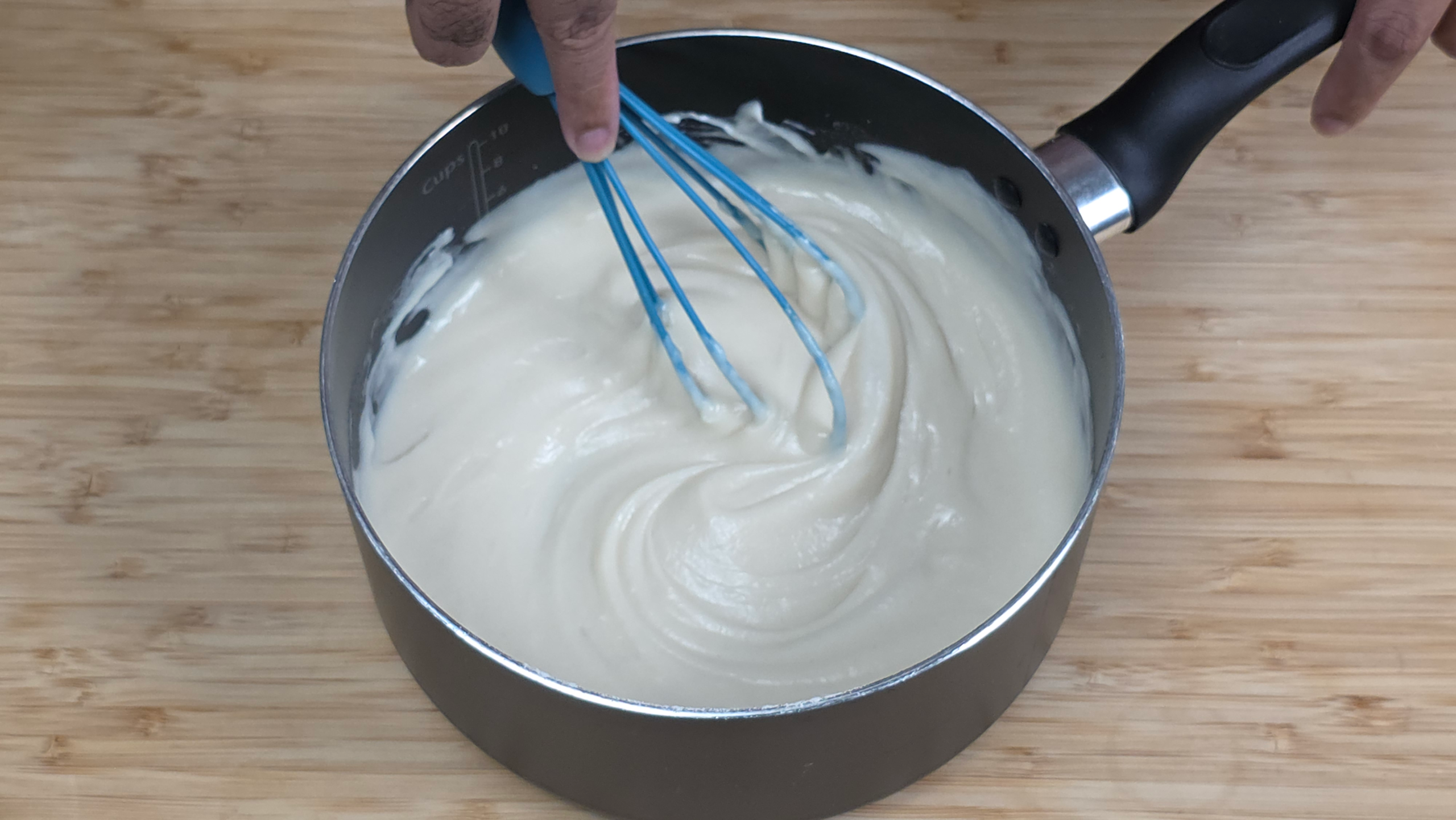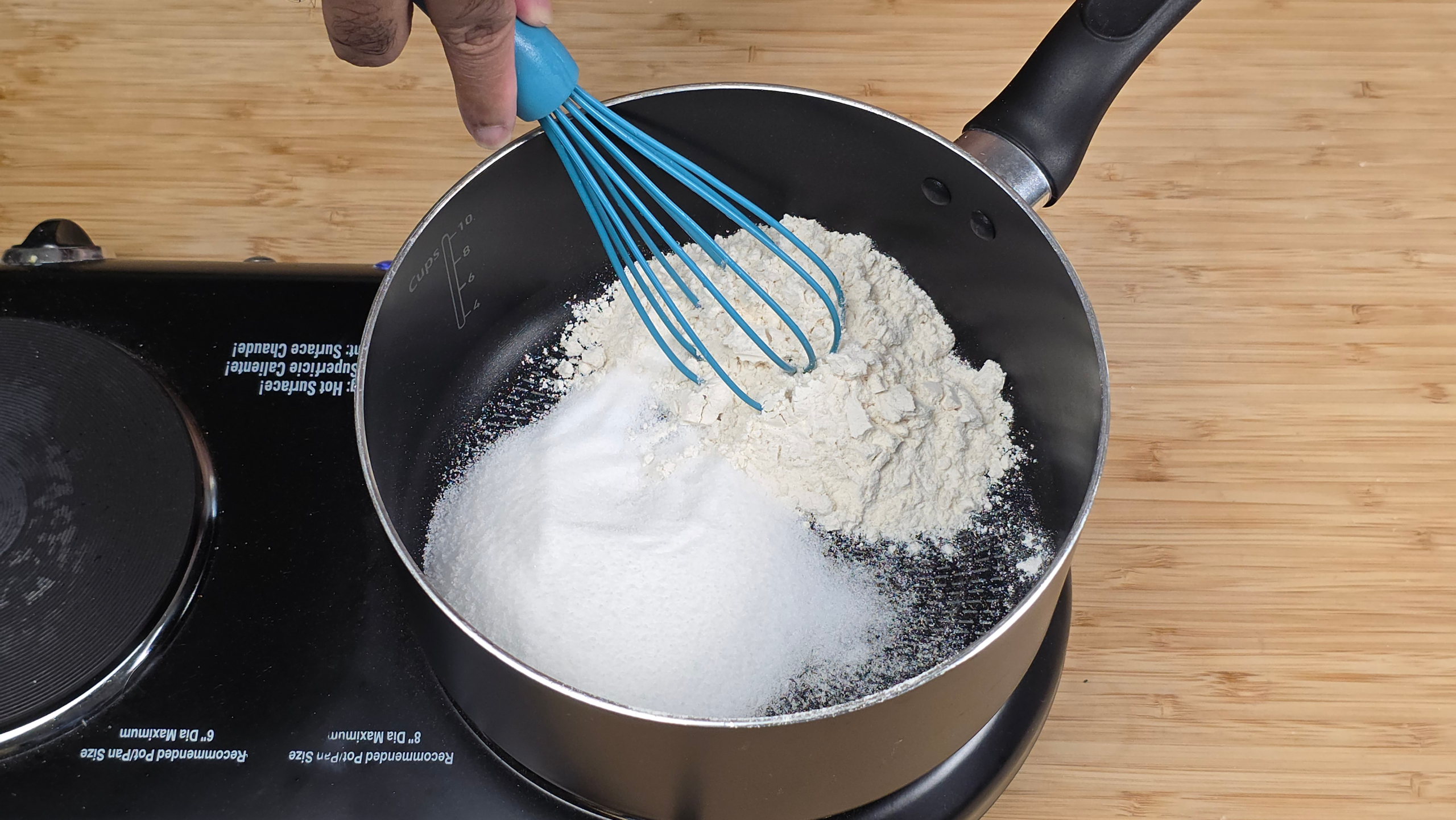- Add flour, salt, sugar and half + half to cool 3qt saucepan and mix until combined, ensuring few/no clumps.